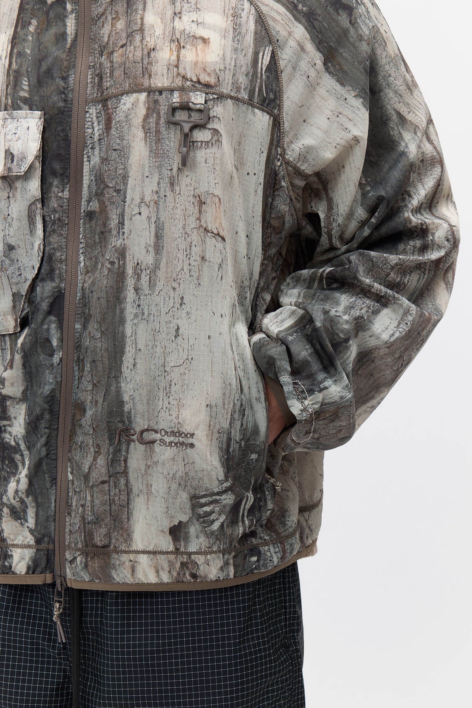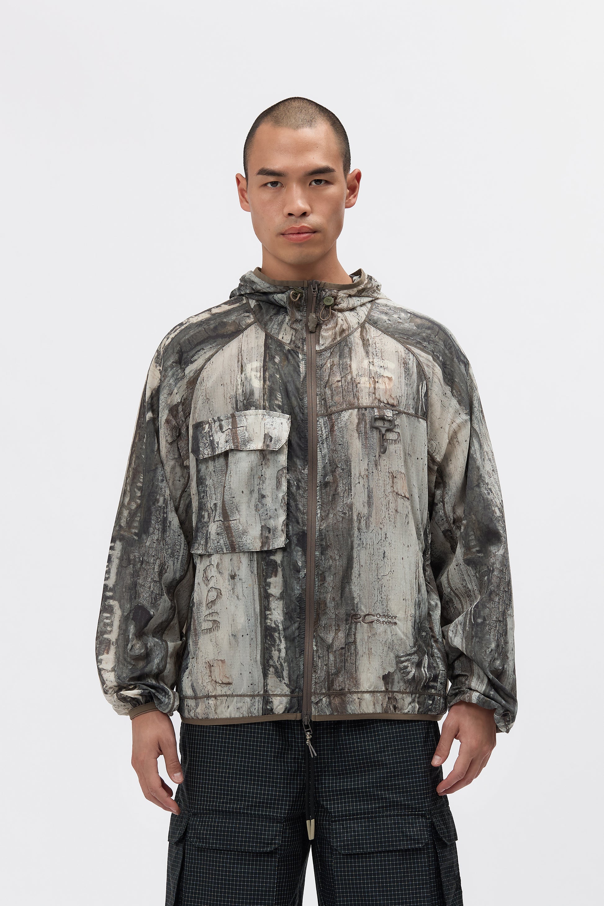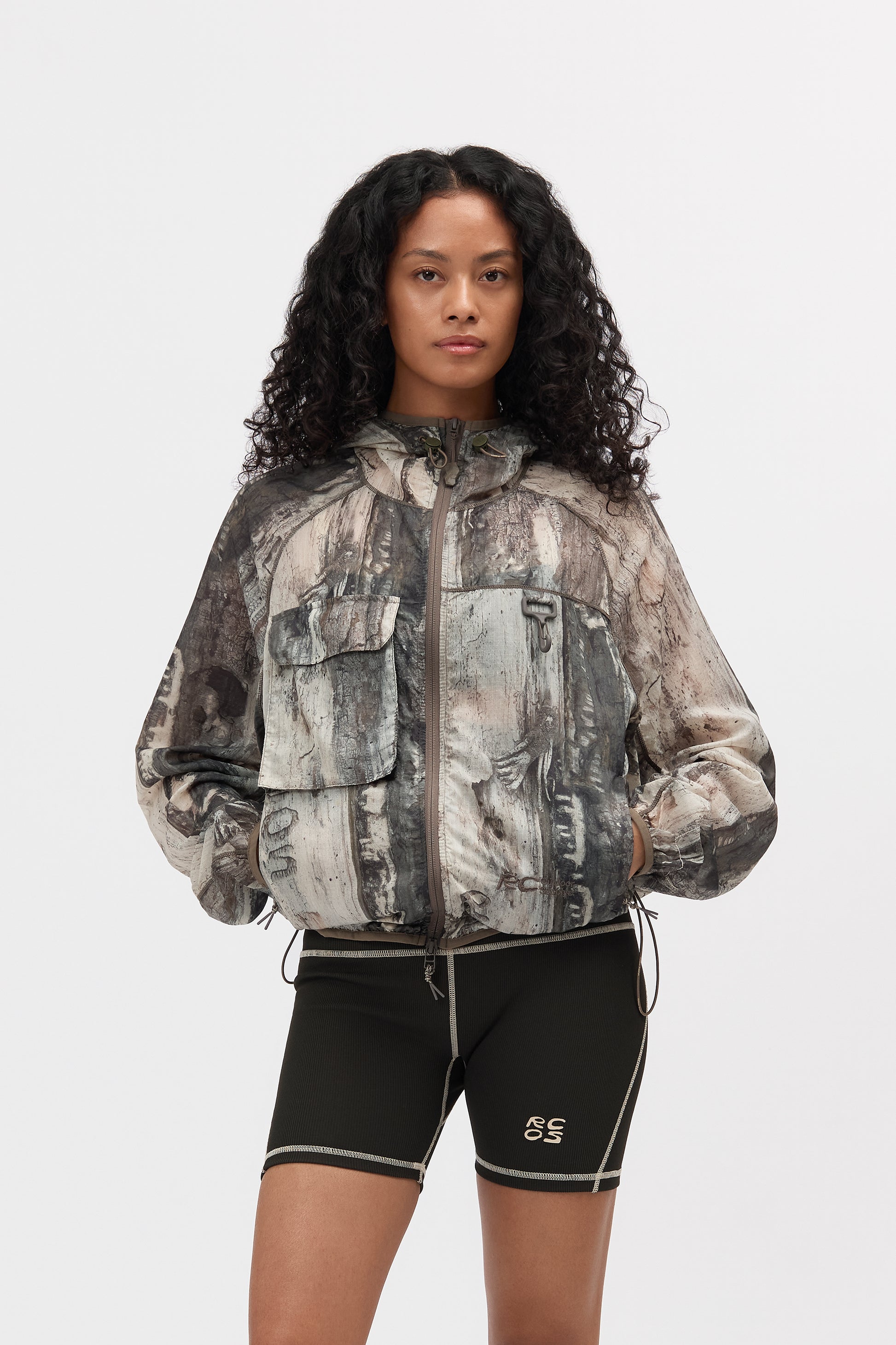 The ideal ultralight jacket for running, hiking or daily wear. The jacket is constructed from a lightweight nylon ripstop and is fully packable into a crossbody bag. The jacket has a cargo pocket on the front, concealed zipper hand pockets & adjustable bungee cording throughout. Due to the nature of the fabric print, each piece will be unique.