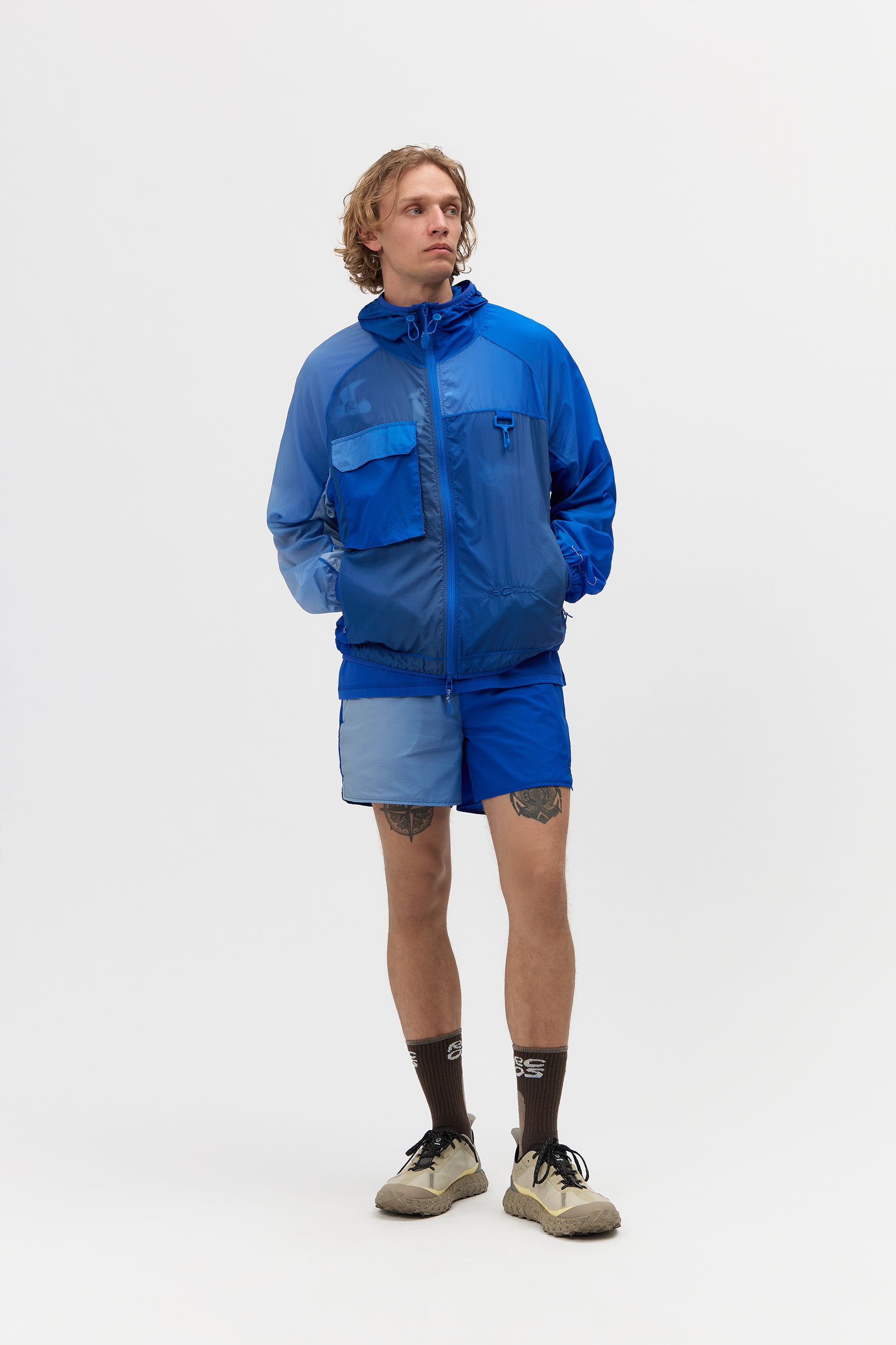 The ideal ultralight jacket for running, hiking or daily wear. The jacket is constructed from a lightweight nylon ripstop and is fully packable into a crossbody bag. The jacket has a cargo pocket on the front, concealed zipper hand pockets & adjustable bungee cording throughout. Due to the nature of the fabric print, each piece will be unique.