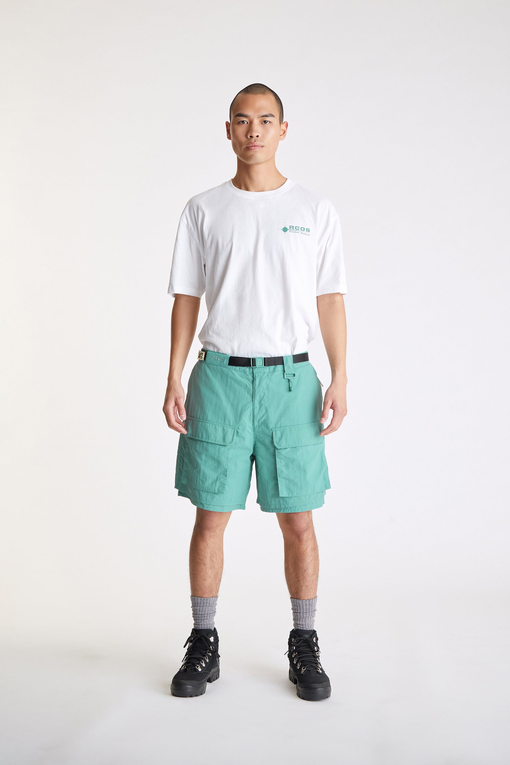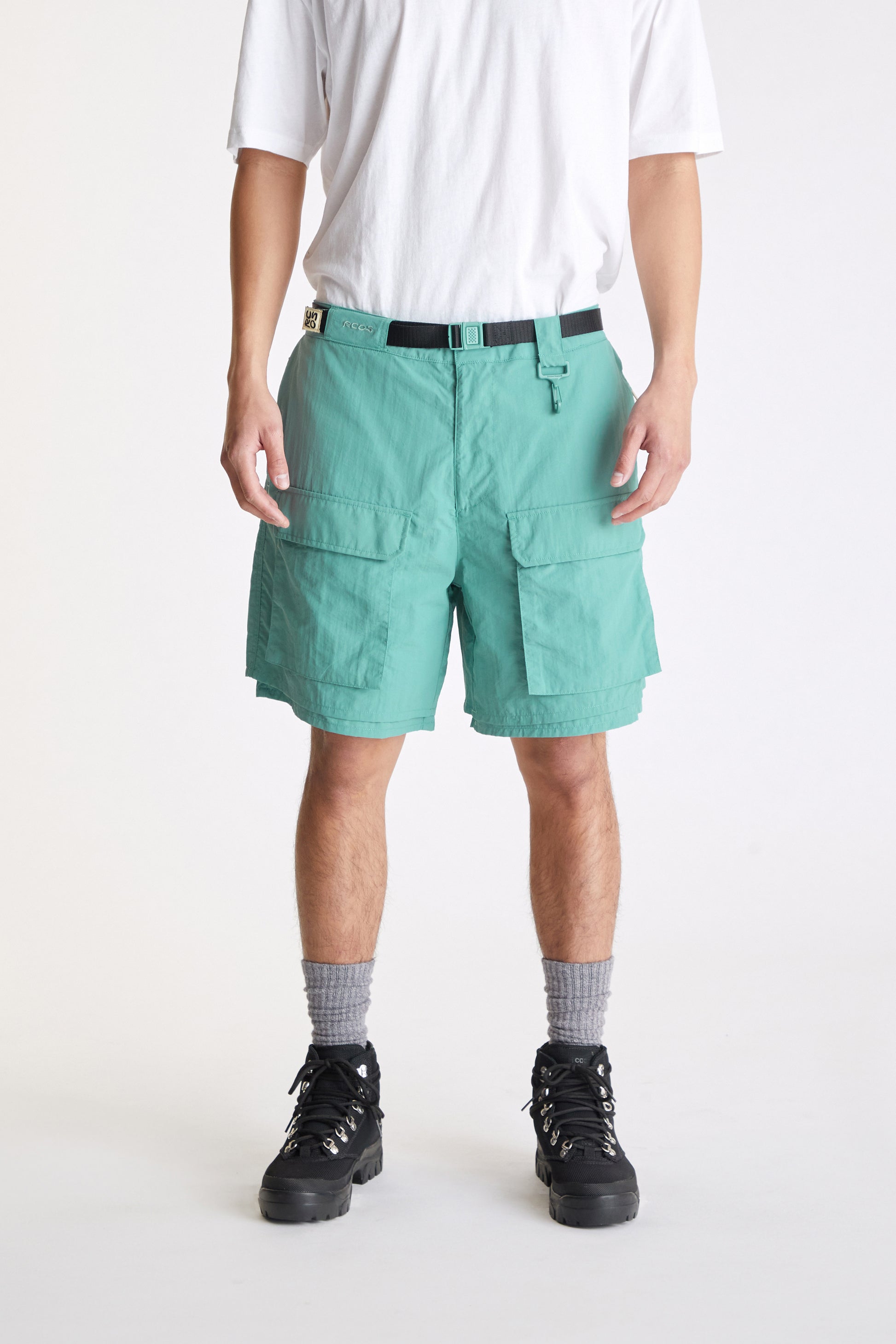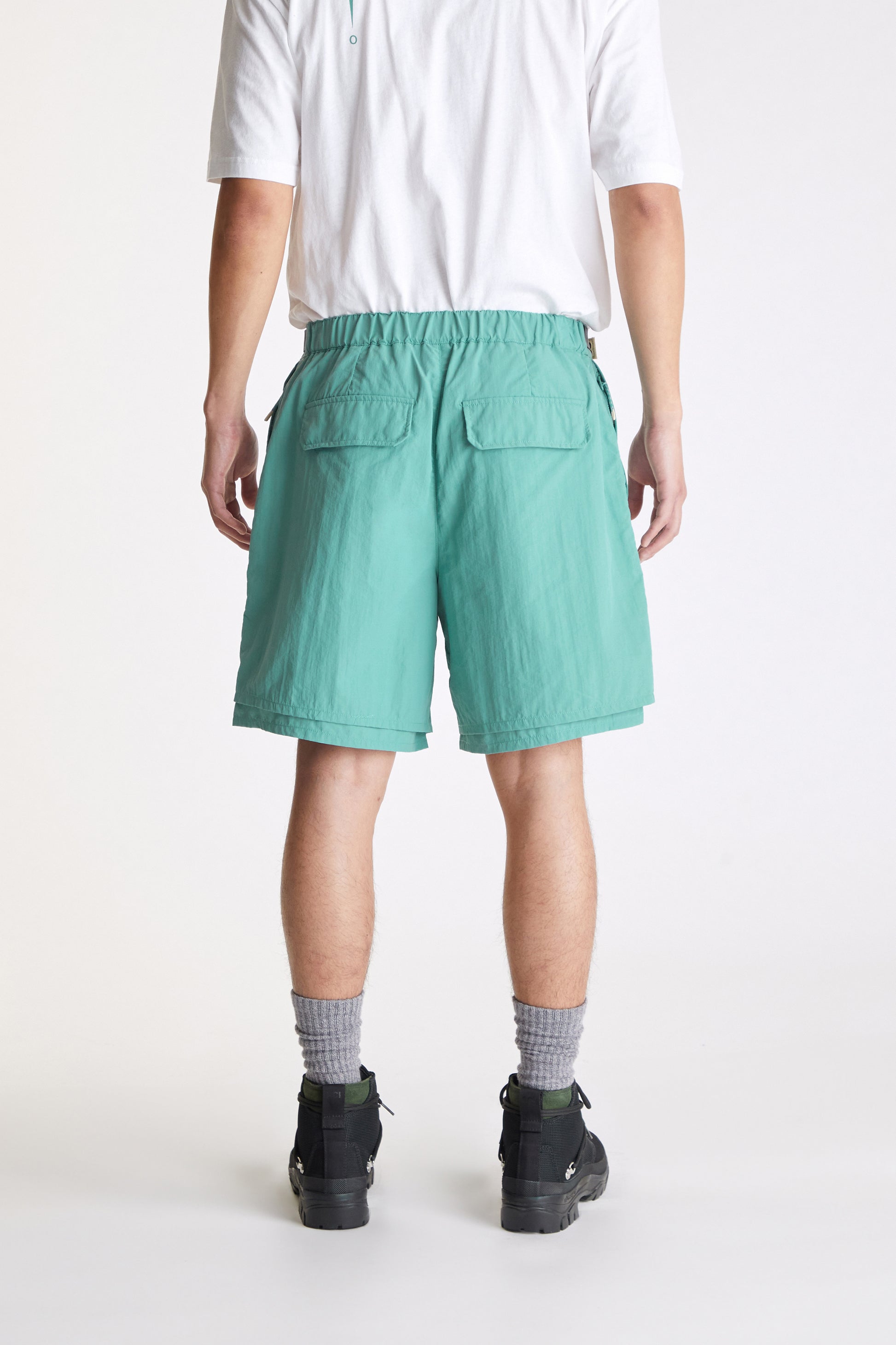 A double layered cargo short made in a medium weight nylon twill. The shorts have a built in nylon webbing belt with a buckle closure, zipper closure hand pockets, cargo pockets on the front & welt pockets on the back.