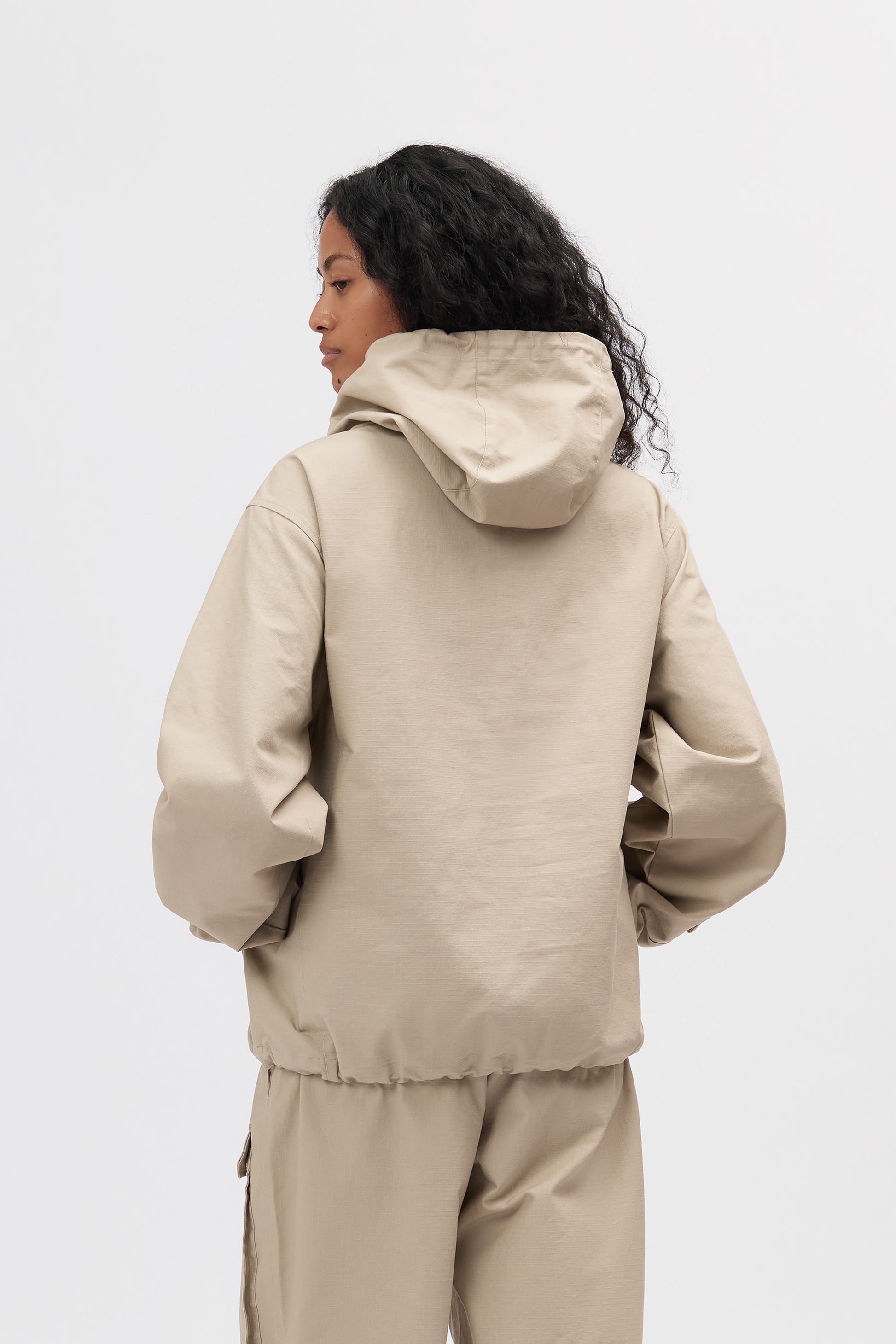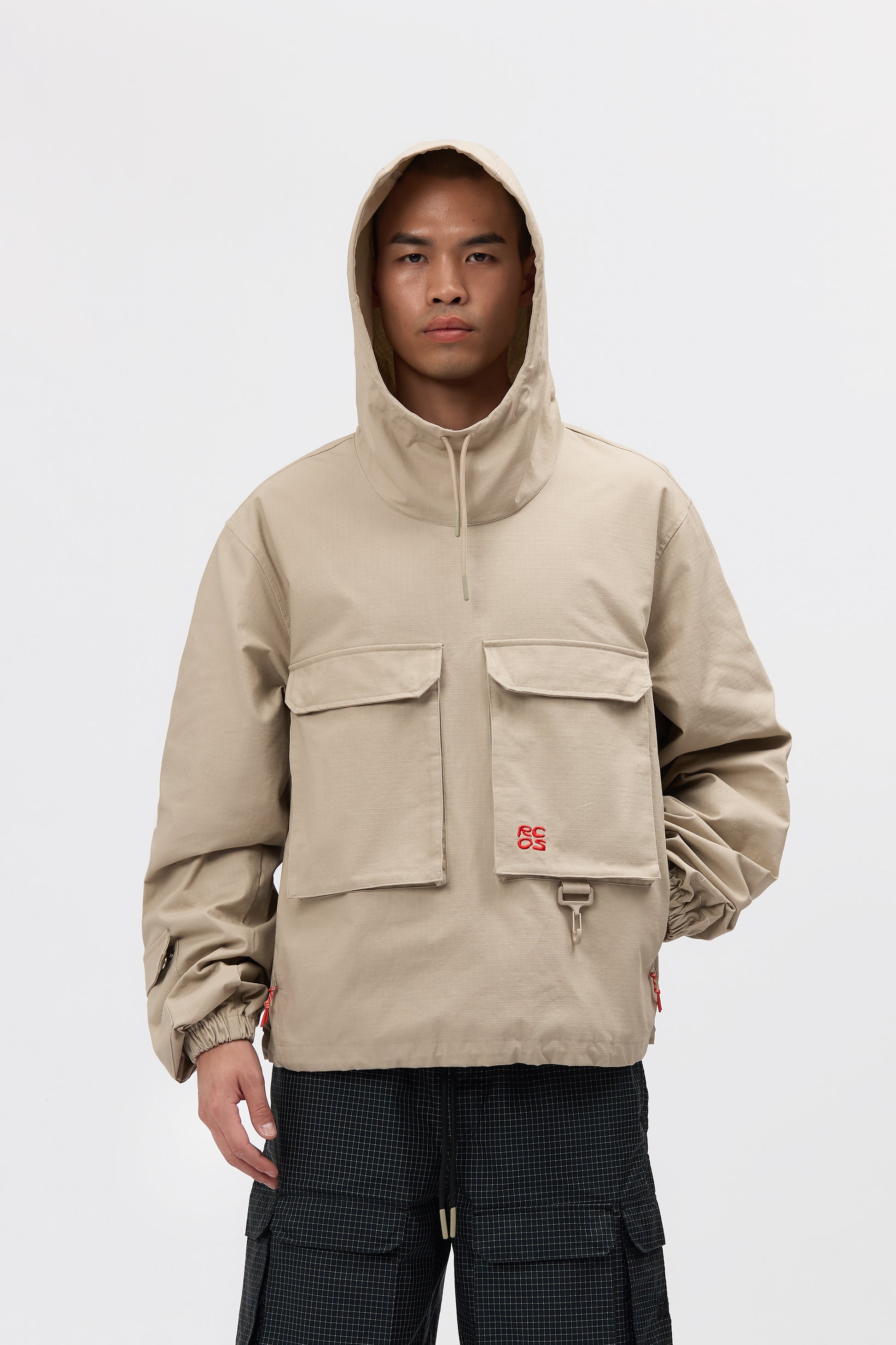 An oversized hooded anorak constructed from a heavy duty cotton ripstop. The anorak has contrast embroidery & zipper cording, cargo pockets on the front & sleeve, concealed zipper hand pockets & adjustable bungee cording in the hem & hood.