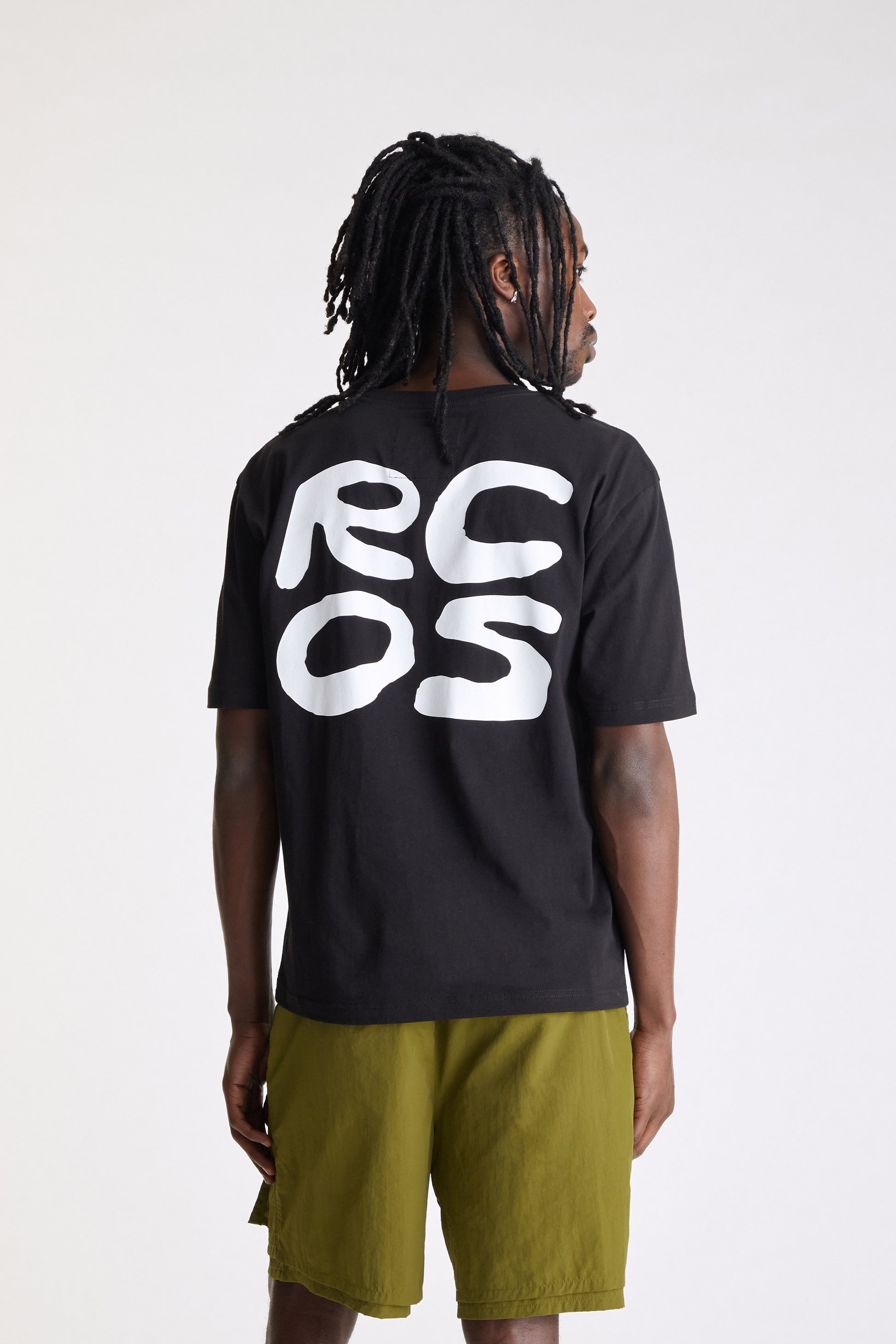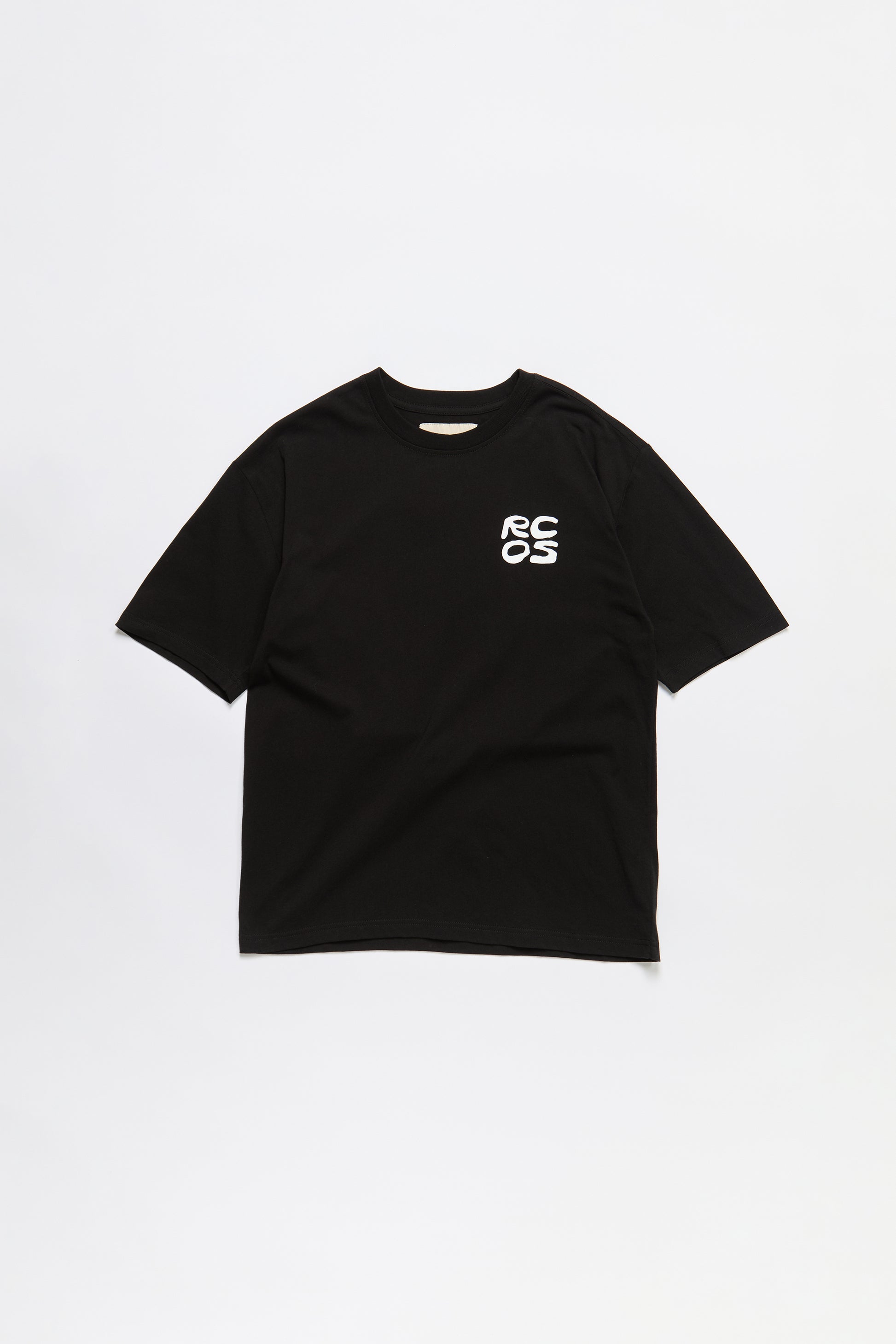 A short sleeve cotton t-shirt with the RCOS stack logo screenprinted on the front and back.