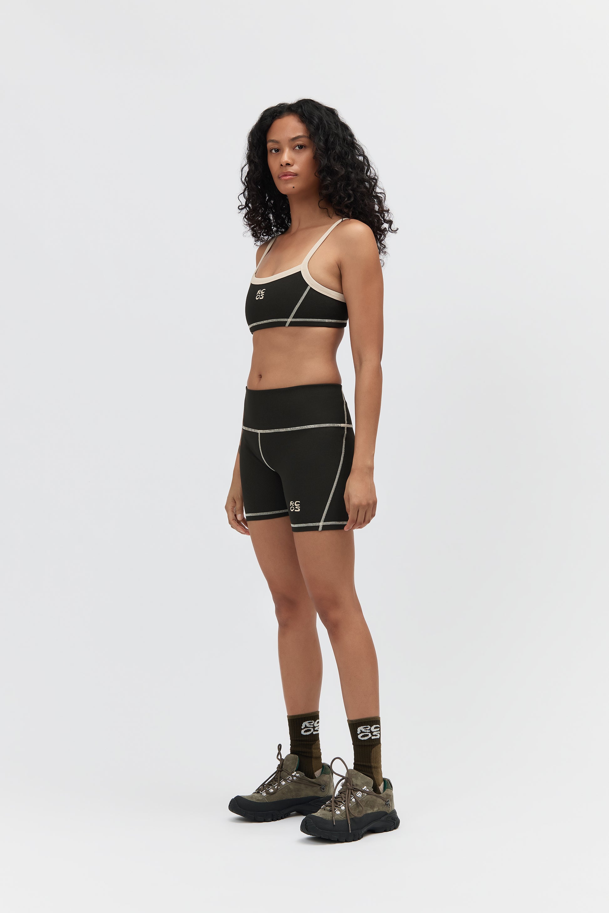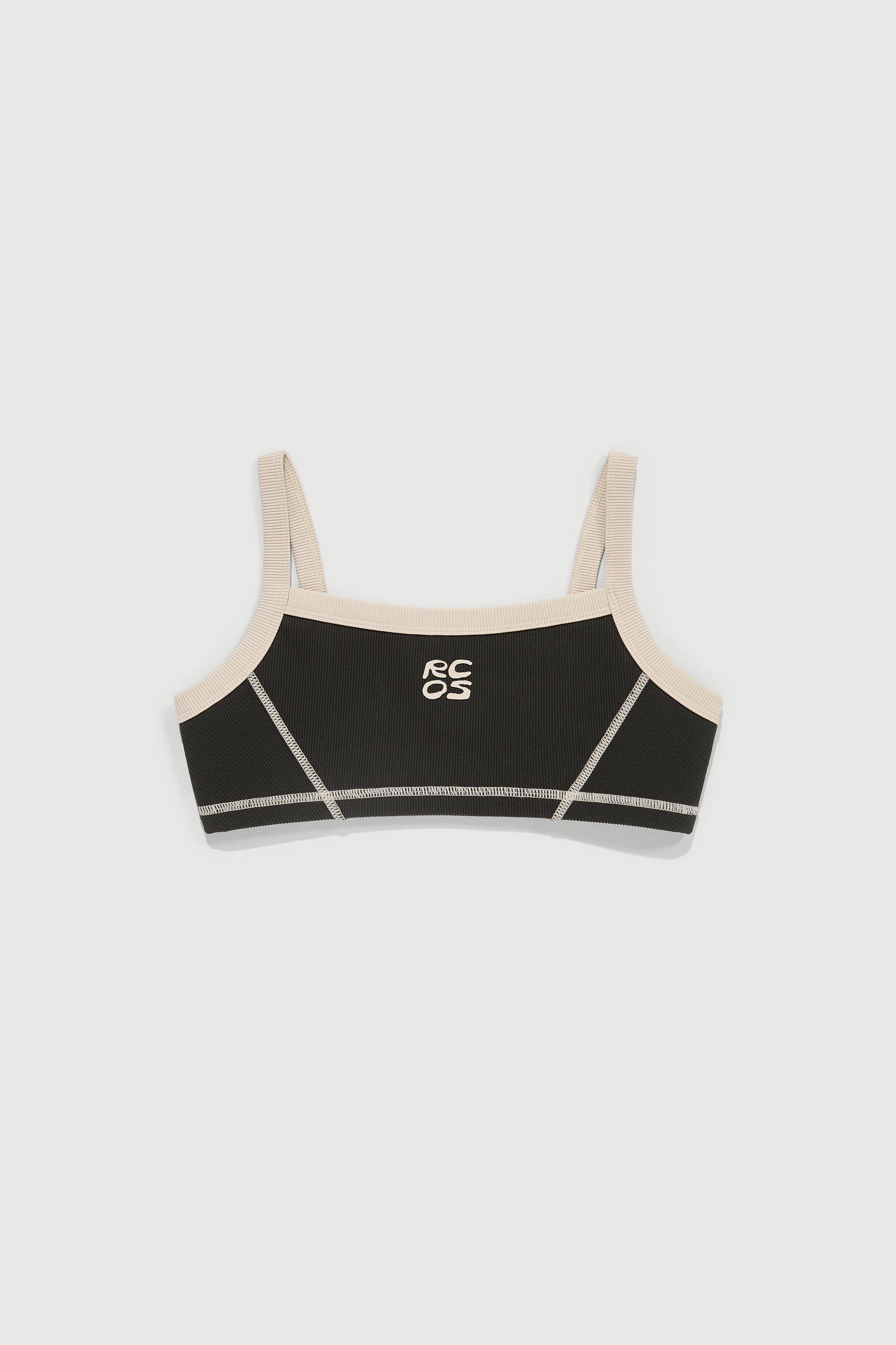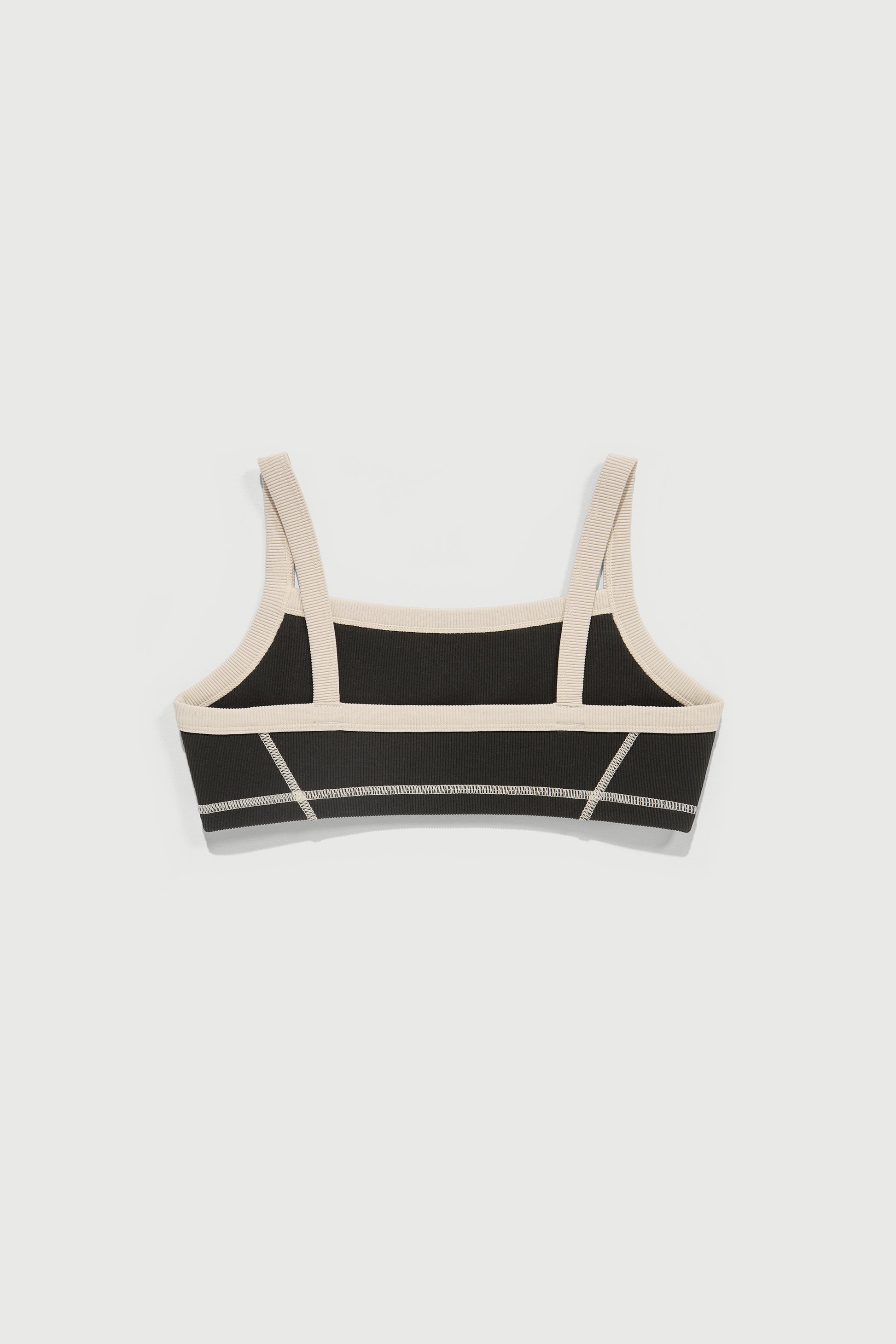 An everyday bra for the trail or studio, made from a supportive ribbed fabric with contrast stitching.