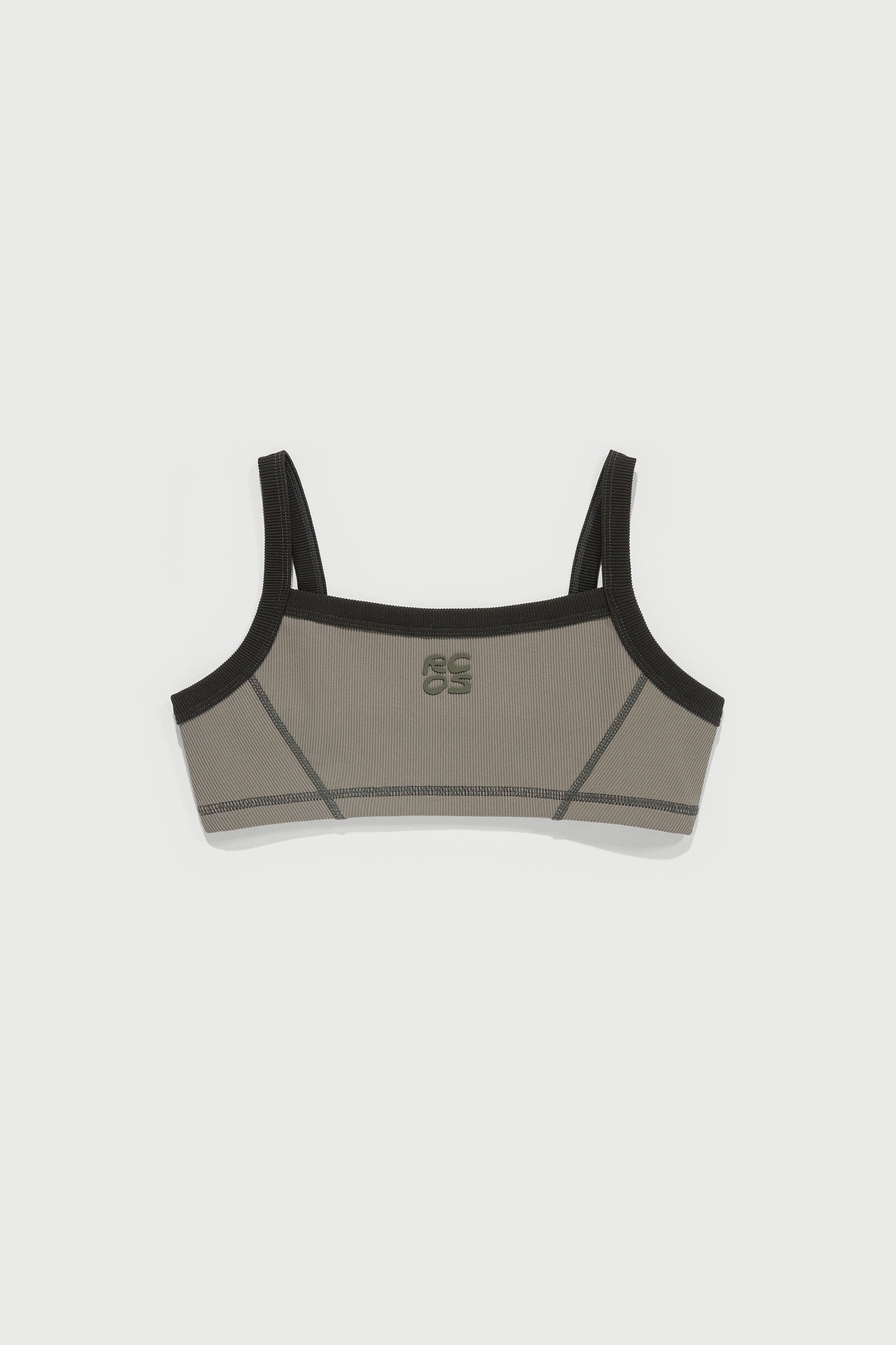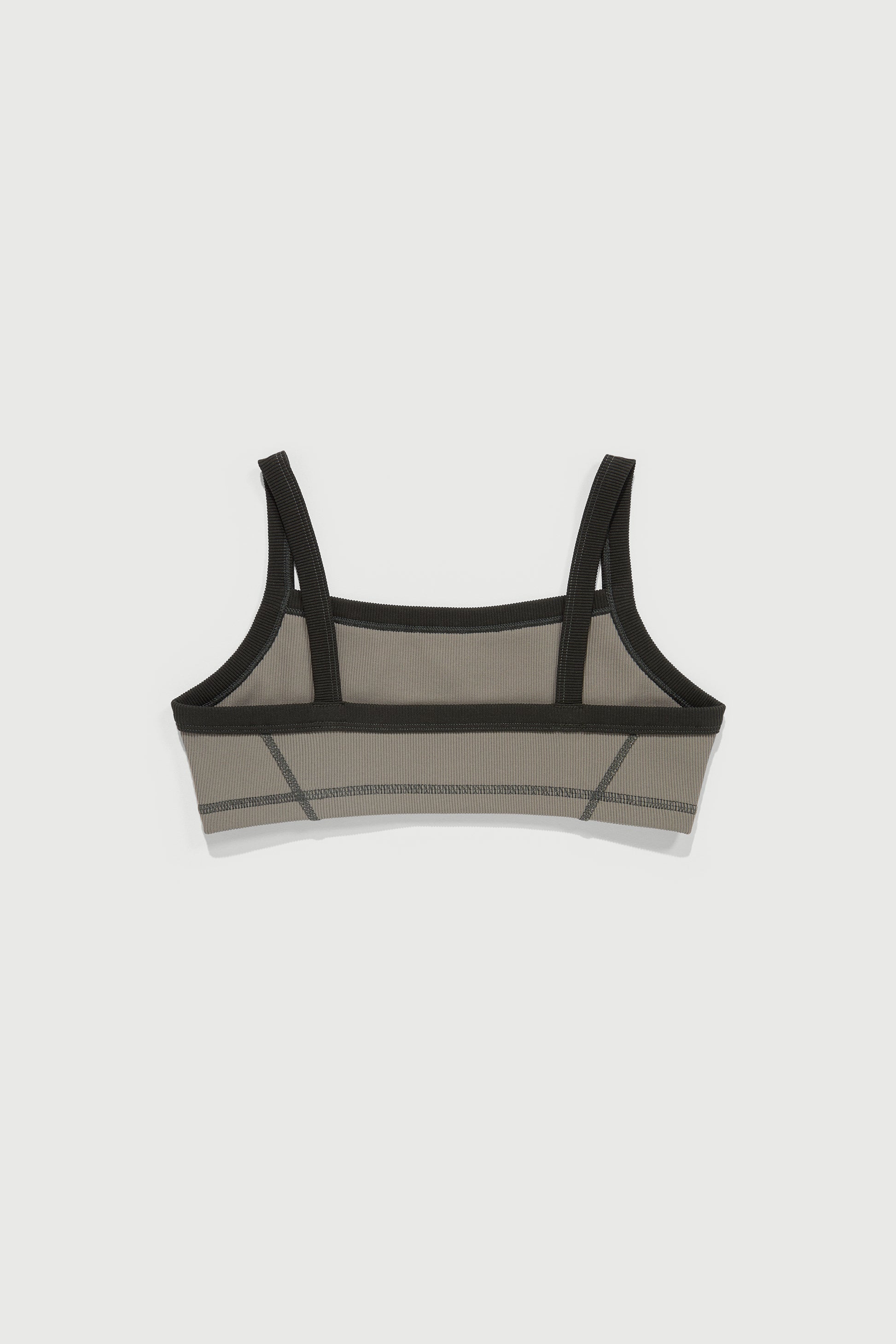 An everyday bra for the trail or studio, made from a supportive ribbed fabric with contrast stitching.